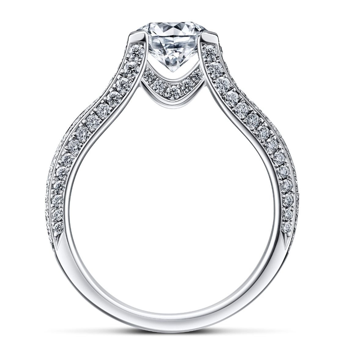 天空に浮かび上がるように高く掲げられたセンターストーン、そして優美な曲線を描くサイドビューなど、輝きのみで構成されたかのように芸術性あふれるアイコンリングです。