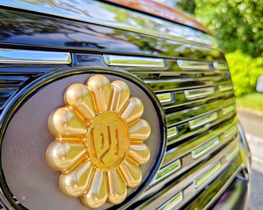 車の顔ともいえるエムブレムは、無垢材の真鍮インゴットからの精密金属加工削り出しを行った逸品。王室馬車風のゴールドラインを纏う漆塗りを再現した特注カラーリングにもしっかりと真鍮ならでは光沢の華を添えております。